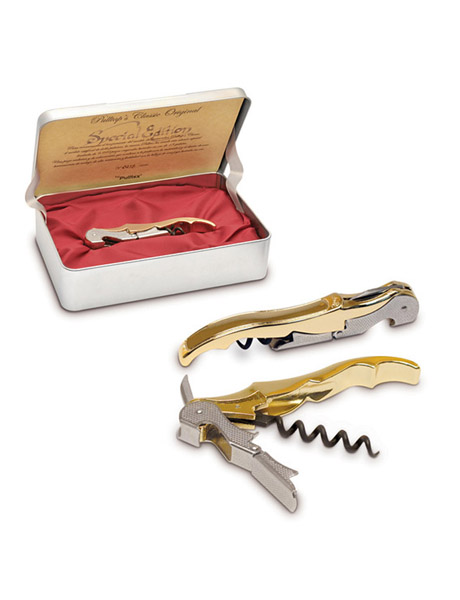 Set composed of a Pulltap’s Classic cork remover. The Pulltap’s corkscrew model with its double lever system, allows for the extraction of the cork in 2 steps without bending or breaking,with great ease and comfort. The double lever system is internationally patented. The spiral is teflon-coated, allowing a smooth entrance into the cork without breaking it. Also, it has a specially developed blade for cutting the capsule that covers the neck of the bottle in a quick and simple manner. The product in painted in gold.
