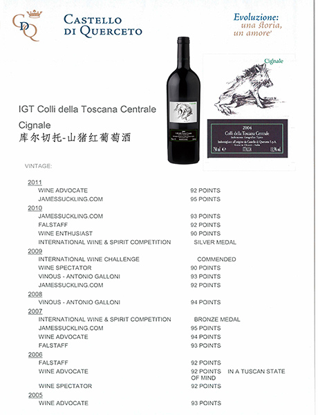 2013 RobertParker, 90p - vinous.com (Antonio Galloni), 94p - 2012 JamesSuckling, 95p - Wine Spectator, 90p - Falstaff, 93p - IWSC, Bronze medal - 2011 Wine Advocate, 94p - 2010 Falstaff, 92p - 2009 Falstaff, 89p - 2008 Wine Spectator, 89p - 2007 Wine